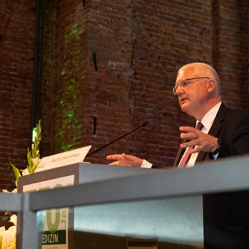 Mit 2.000 Betten und rund 11.500 Mitarbeitenden in ca. 50 Fachkliniken, Instituten und Abteilungen ist das LMU Klinikum heute das zweitgrößte Klinikum Deutschlands. Pro Jahr werden dort ambulant und stationär 500.000 Patienten versorgt. Die Medizinische Fakultät bildet bundesweit die meisten Medizinstudierenden aus, derzeit sind es rund 6.000. „Beste Köpfe, gute Strukturen, starke Verbünde – das ist das Motto, das wir versuchen, in der täglichen Arbeit umzusetzen“, sagte Prof. Dr. Thomas Gudermann, Dekan der Medizinischen Fakultät in seinem Festvortrag „Die LMU Medizin: Gestern, Heute, Morgen”. „Wir sind die einzige Fakultät in Deutschland, die in allen acht Deutschen Zentren der Gesundheitsforschung vertreten und damit in der Breite der medizinischen Exzellenz einzigartig ist.“ Dazu kommen sechs Sonderforschungsbereiche der Deutschen Forschungsgemeinschaft, in denen die LMU als Sprecher auftritt. Als führende vollständige Fakultät könne die Medizinische Fakultät der LMU junge angehende Ärztinnen und Ärzte vom ersten bis zum letzten Studiensemester in allen Disziplinen auf dem aktuellen Stand des Wissens und höchstem Niveau ausbilden, so Gudermann. Hervorzuheben ist neben dem Nachwuchsförderprogramm „Munich Clinician Scientist Program“, das Forschung und Patientenversorgung eng verzahnt, auch das Medizinische Curriculum München (MeCum), das auf dem Konzept des problemorientierten Lernens der Harvard Medical School basiert.