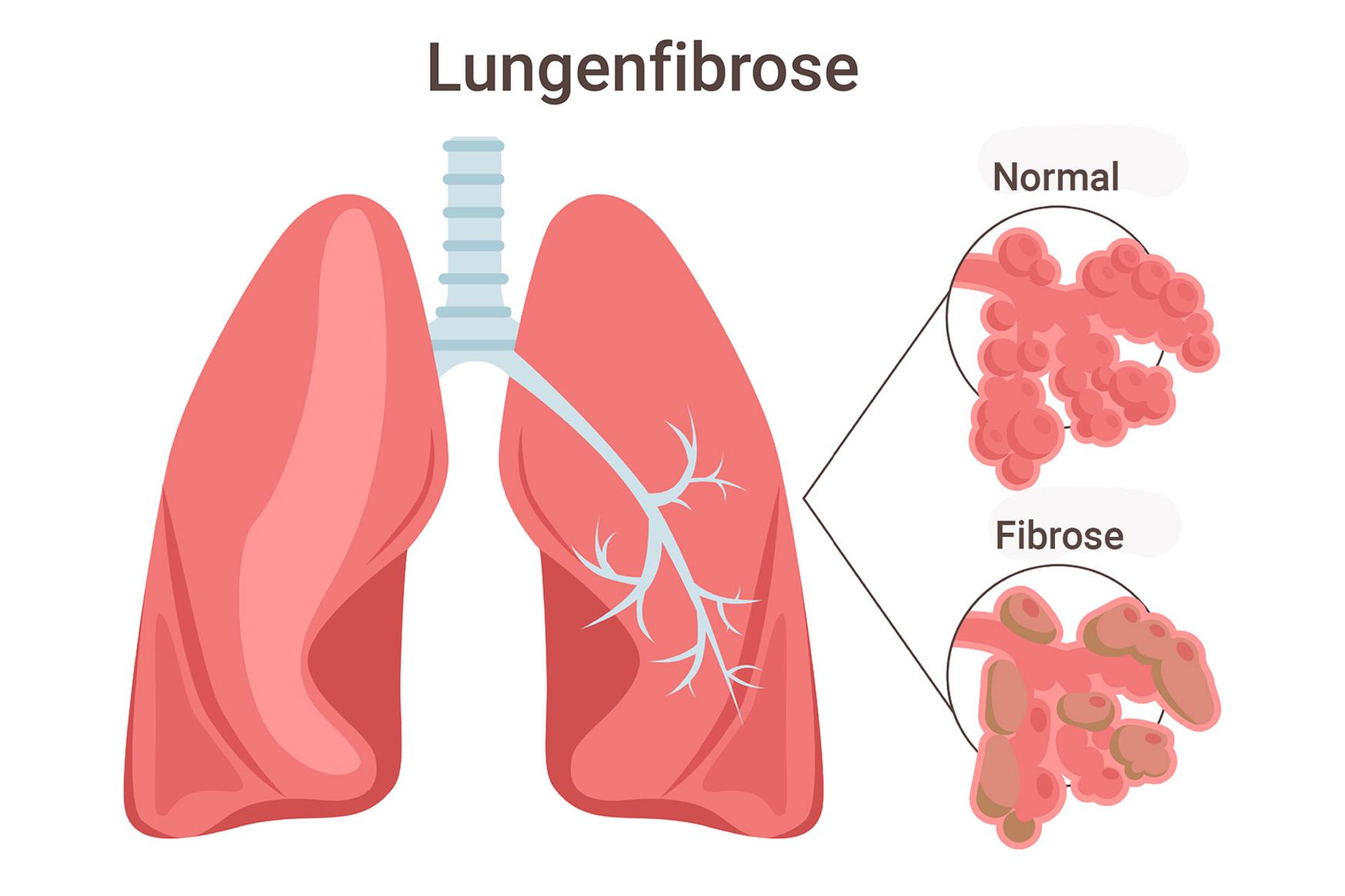 Bei einer Lungenfibrose verdickt und vernarbt das Lungengewebe, die Elastizität der Lunge nimmt ab, die Sauerstoffaufnahme wird zunehmend schlechter.
